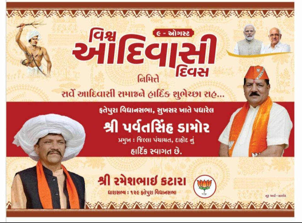 તારીખ 9 ઓગસ્ટ વિશ્વ આદિવાસી દિવસ ની ઉજવણી ફતેપુરા વિધાનસભાની ફતેપુરા તાલુકાના સુખસર મુકામે એસાર પેટ્રોલ પંપ ની બાજુમાં વિશ્વ આદિવાસી દિવસની ઉજવણી નો કાર્યક્રમ ફતેપુરા વિધાનસભા માં સમાવેશ ફતેપુરા તાલુકો અને સંજેલી તાલુકા ના દાહોદ જિલ્લા પંચાયત ના પ્રમુખ પર્વતસિંહ ડામોર ને અધ્યક્ષતામાં સવારના 9:00 કલાકે રાખવામાં આવેલ છે જેમાં ફતેપુરા વિધાનસભાના ધારાસભ્ય રમેશભાઈ કટારા સહિતના આગેવાનો ઉપસ્થિત રહેશે કેન્દ્ર સરકાર અને રાજ્ય સરકારની વિવિધ યોજનાઓના નું વિતરણ લાભાર્થીઓને કરવામાં આવશે
