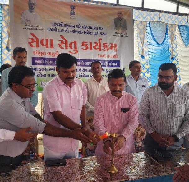 ફતેપુરા તાલુકાના નીંદકાપુવૅ ગામે સેવા સેતુ કાર્યક્રમ ફતેપુરા ધારાસભ્ય શ્રી રમેશભાઈ કટારા ની અધ્યક્ષતામાં સેવા સેતુ કાર્યક્રમ દીપ પ્રજલિત કરી કાર્યક્રમને ખુલ્લો મુકવામાં આવ્યો હતો દાહોદ જિલ્લા ભાજપ પ્રમુખ શંકરભાઈ આંમલીયાર તાલુકા પંચાયતના પ્રમુખ ભરતભાઈ જિલ્લા પંચાયતના સભ્ય સોનલબેન મછાર તાલુકા પંચાયતના સભ્ય તેઝુડીબેન મછાર ઝાલોદ પ્રાંત અધિકારી ભાટીયા મામલતદાર એન.એસ વસાવા તાલુકા વિકાસ અધિકારી યોગેશભાઈ બારીયા તેમજ લાગતા વલગતા વિભાગના અધિકારી કર્મચારી ગણ તેમજ ખૂબ જ મોટી સંખ્યામાં અરજદારો ઉપસ્થિત રહ્યા હતા સરકારી સેવાઓ નો લાભ ઘર આંગણે પહોંચાડવા તેમજ જન પ્રશ્નોનો સ્થળ પર જ નિવારણ લાવી નાગરિકોને સરકાર સાથે જોડતો સેતુ એટલે સેવા સેતુ કાર્યક્રમ સેવા સેતુ કાર્યક્રમમાં ૫૫ જેટલી જન કલ્યાણ લક્ષી સેવા સુવિધા સેવા સેતુમાં નાગરિકોને સ્થળ પરજ પુરી પાડવાનો ઉદ્દેશ્ય છે લાભાર્થીઓને યોજનાકીય લાભોનો વિતરણ ઉપસ્થિત મહાનુભાવો ના હસ્તે વિતરણ કરવામાં આવ્યું હતું ધારાસભ્ય રમેશભાઈ કટારા ઊભા કરવામાં આવેલ સ્ટોળ ની મુલાકાત લીધેલ હતી