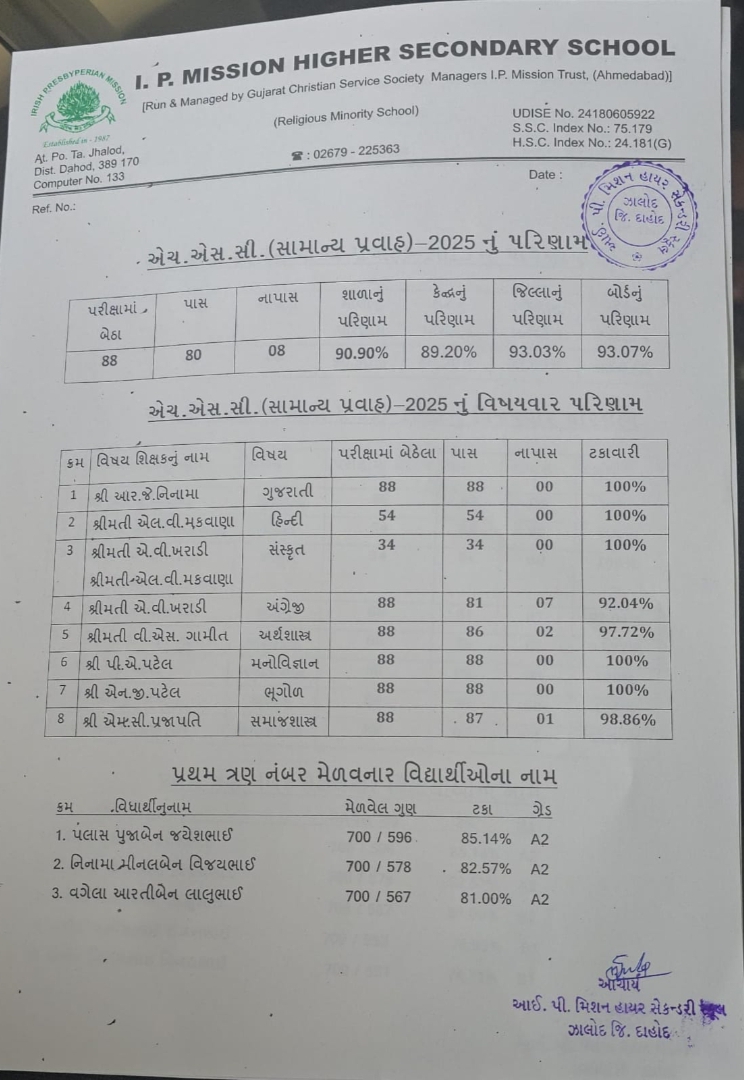 ઝાલોદ આઇ.પી.મીશન હાયર સેકન્ડરીનુ ઝળહળતુ પરિણામ શાળાનું પરિણામ 90.90%