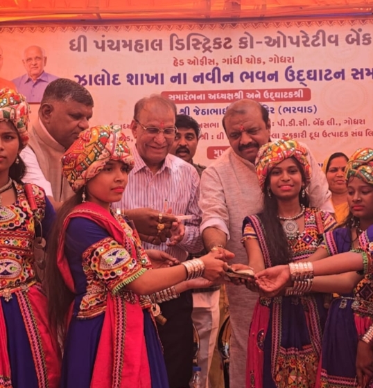ગુજરાતના સુપ્રસિદ્ધ ગુજરાતી લહેરી લાલાના સુંદર પ્રદર્શન પર સહુ મહેમાનો ખુશ થઈ ઇનામો આપ્યાઆજરોજ 08-06-2025 રવિવારના રોજ ઘી પંચમહાલ કો.ઓ.બેંક લિ ના નવીન ભવનના ઉદ્ઘાટન પ્રસંગે ઝાલોદ એ.પી.એમ.સી ખાતે આજના સમારંભના અધ્યક્ષ તેમજ વિધાનસભા ઉપાધ્યક્ષ , પી.ડી.સી બેંક લિ ગોધરા ચેરમેન , ઘી પંચમહાલ જિલ્લા સહકારી દૂધ ઉત્પાદક સંઘ લી ચેરમેન, નાફેડ ન્યુ દિલ્હીના ચેરમેન જેઠાભાઈ આહીર ( ભરવાડ) વિશેષ ઉપસ્થિત રહેલ હતા. આ પ્રસંગે આવેલ વિશેષ ઉપસ્થિત મહેમાનોનુ સ્વાગત આદિવાસી ઢોલકુંડી થી કરવામાં આવ્યું હતું. ઉપસ્થિત મુખ્ય અતિથિ જેઠાભાઈ ભરવાડ દ્વારા બેંકના નવીન ભવનની તકતી ખુલ્લી મૂકી તેમજ પૂજા અર્ચન કરી રીબીન કાપી ઉદ્ઘાટન કરવામાં આવ્યું હતું.