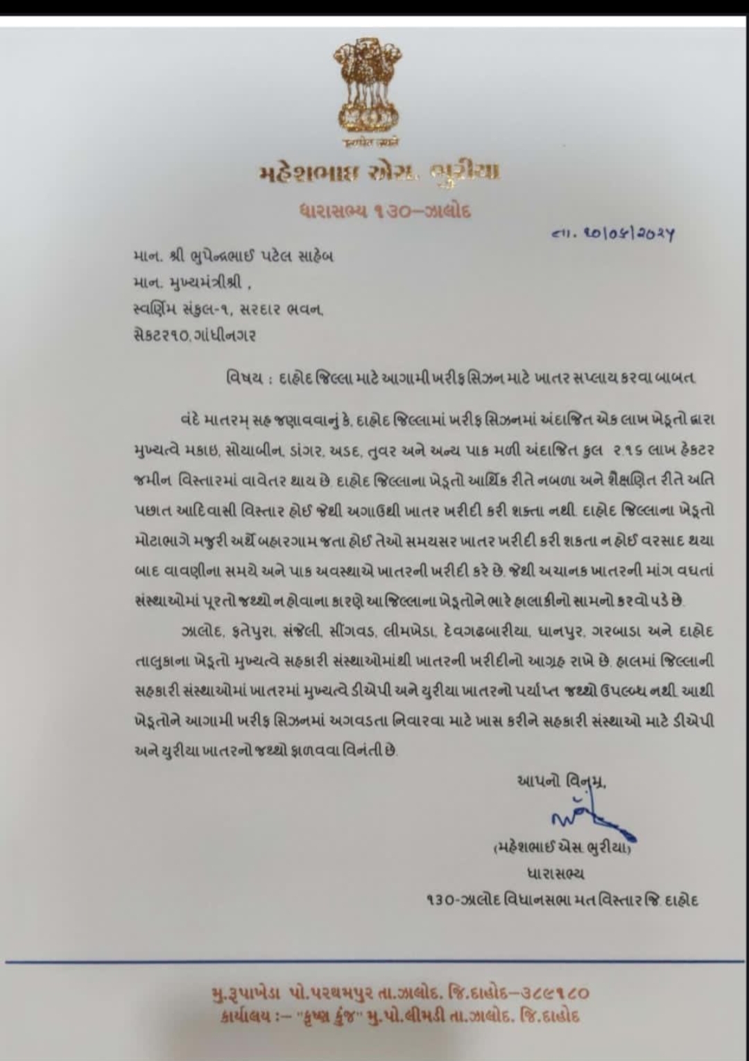 દાહોદ જિલ્લામા ખરીફ સિઝનમાં અંદાજીત એક લાખ થી વધુ ખેડૂતો મકાઈ, સોયાબીન, ડાંગર, અડદ, તુવર તેમજ અન્ય પાકનું વાવેતર અંદાજીત 216 હેક્ટરમા કરતા હોય છે. આ વિસ્તારના ખેડૂતો આર્થિક રીતે નબળા તેમજ શૈક્ષણિક રીતે અતિ પછાત છે તેઓ મોટે ભાગે વતન બહાર મજૂરી અર્થે જતા હોય છે અને તેથી તેઓ એડવાન્સમા ખાતર ખરીદી શકતા નથી તેથી અહીંના ખેડૂતો વરસાદ પડે ત્યારબાદ જ ખાતર ખરીદવાનો આગ્રહ રાખે છે. વાવણી સમયે અચાનક માંગ વધતા ખેડૂતોને સમયસર પૂરતા પ્રમાણમા ખાતર મળતું નથી જેથી સહકારી સંસ્થામાં ખાતરની અવ્યવસ્થા ન સર્જાય તે માટે વાવણીના સમયે ખેડૂતો ને પૂરતા પ્રમાણમાં સમયસર ખાતર મળી રહે તે માટે મુખ્યમંત્રી ભુપેન્દ્ર પટેલને એક લેખિત રજૂઆત ઝાલોદ 130 ધારાસભ્ય મહેશ ભૂરીયા દ્વારા કરવામાં આવેલ છે.