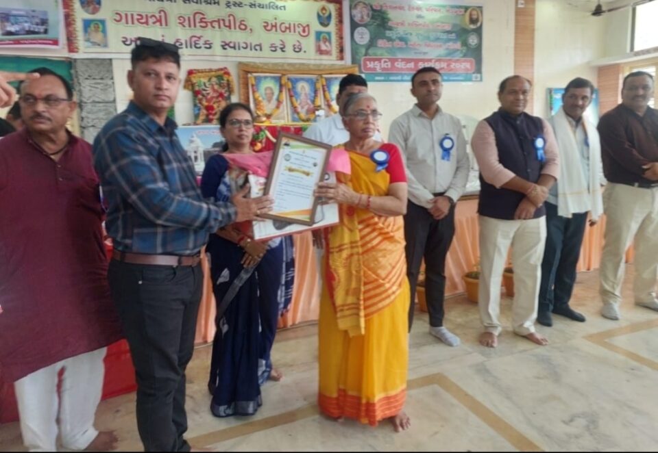 અંબાજી ખાતે યોજાયો .ગાયત્રી શક્તિપીઠ, તીર્થધામ અંબાજી તીર્થધામ ખાતે પ્રકૃતિ સંવર્ધન પ્રત્યે જાગૃતિ લાવવાનો અનોખો પ્રયાસ રૂપે પ્રકૃતિ મિત્ર એવોર્ડ વિતરણ સમારોહનો ભવ્ય કાર્યક્રમ યોજાયો. આ કાર્યક્રમનું આયોજન કે.ટી પરિવાર ખેડબ્રહ્મા, તથા રિહેજ એચ મહેતા વિદ્યાલય, ગાયત્રી શક્તિપીઠના સંયુક્ત ઉપક્રમે યોજવામાં આવ્યો હતો. કાર્યક્રમની શરૂઆત શાળાના વિદ્યાર્થીઓ દ્વારા રજુ કરાયેલા પ્રાર્થના ગાનથી કરવામાં આવ્યો હતો. ત્યારબાદ બાળકો દ્વારા આદિવાસી લોક નૃત્ય રજૂ કરવામાં આવ્યું હતું. ગુજરાતના વિવિધ જિલ્લાઓમાંથી હાજર રહેલા 185 થી વધુ શિક્ષકો સીઆરસી ,બીઆરસી તેમજ અન્ય ક્ષેત્રમાંથી પધારેલ અધિકારીઓ તેમજ પર્યાવરણ ક્ષેત્રે સેવા આપતા પ્રતિષ્ઠિત વ્યક્તિઓને આ પ્રસંગે ‘ પ્રકૃતિ મિત્ર એવોર્ડ’ થી સન્માનિત કરવામાં આવ્યા હતા. આ કાર્યક્રમમાં બારીયા ફળિયા વર્ગ પ્રાથમિક શાળાના પંચાલ રાજેશકુમાર સુંદરલાલ ને પણ આ એવોર્ડ થી નવાજવામાં આવતા સમગ્ર પ્રેક્ષાગૃહ તાલીઓના ગડ ગડાટ થી ગુંજી ઉઠ્યું હતું.