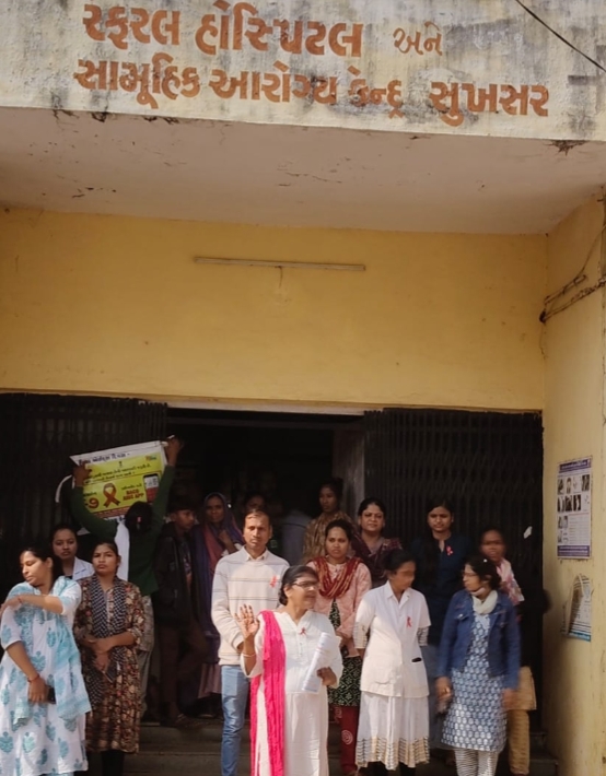 ફતેપુરા… મુખ્ય જિલ્લા આરોગ્ય અધિકારી ઉદય ટિલાવત અને જીલ્લા ટી.બી અને એચ.આઇ.વી અધિકારી આર.ડી.પહાડીયા અને ડી.એ.પી.સી.યુ દાહોદના માર્ગદર્શન હેઠળ 1લી ડિસેમ્બર “વિશ્વ એઇડ્સ દિવસ” 2025 ની થીમ “એઈડ્સ ના પ્રતિભાવમાં પરિવર્તન લાવો, વિક્ષેપ દુર કરો”. આજરોજ વિશ્વ એઈડ્સ દિવસ નિમિત્તે સા.આ.કેન્દ્ર સુખસર ખાતે અધિક્ષક ભરત વી. પટેલ, આઈસીટીસી કાઉન્સિલર નયનાબેન દરજી અને એલ.ડબલ્યુ.એસ વર્કર અને સુખસર દવાખાનાના તમામ સ્ટાફ દ્વારા વિશ્વ એઇડ્સ દિવસની ઉજવણી કરવામાં આવી હતી. દવાખાનાના સ્ટાફ અને સાઇ નર્સિંગ સ્કૂલની વિધાર્થીનીઓ દ્રારા પોસ્ટર પ્રદર્શન અને નાટકના માધ્યમથી એચ.આઇ.વી/એઇડ્સને અટકાવવા માટેની માહિતી આપી હતી.સુખસર સ્ટાફ દ્વારા રંગોળી અને આઈ.ઈ.સી કરી અને એચ.આઈ.વી/એડ્સ માટે જન જાગૃતિ લાવવા માટેની માહિતી આપી. તેમજ કેન્ડલ પ્રગટાવીને શ્રદ્ધાંજલી આપવામા આવી હતી.આ ઉજવણીમાં દવાખાનાનો સ્ટાફ તેમજ હોસ્પિટલ મા આવેલા લાભાર્થીઓને એચ.આઈ.વી/એઇડ્સ,એસ ટી.આઈ ,આર.ટી.આઈ,ટી.બી હિપેટાઇટિસ બી વિશે વિસ્તૃત માહિતી આપવામાં આવી હતી.
