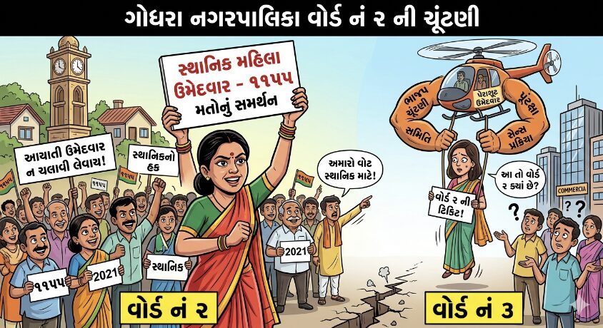ગોધરા નગરપાલિકાની આગામી ચૂંટણીઓ પૂર્વે જ વોર્ડ નં. 2 નું રાજકારણ ગરમાયું છે. ભારતીય જનતા પાર્ટી દ્વારા સેન્સ પ્રક્રિયા પૂર્ણ થયા બાદ, વોર્ડ નં. 2 માં સ્થાનિક અને સક્રિય ઉમેદવારને બદલે વોર્ડ નં. 3 ના ઉમેદવારને ‘આયાતી’ ટિકિટ આપવામાં આવતા મતદારો અને પક્ષના પાયાના કાર્યકરોમાં ઉગ્ર અસંતોષ ફાટી નીકળ્યો છે.